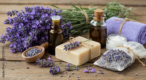 Lavender Lavandula Angustifolia Derivative Products Mockup Highlighting Flower Clusters Leaf Structure Essential Oils Soaps Creams on Rustic Wood Display