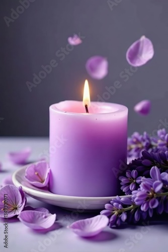 Lavender petals fall gently around a pale purple candle, natural elements,