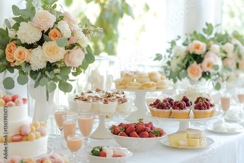 wedding, buffet, dessert, reception, flower, strawberry, cake, sweet, table, celebration, luxury, sweetness, party, elegance, delicious, catering, festivity, event, display, fruit, pastry, cream, treat, joyful, beautiful, festive, seasonal, arrangement, epicure, design, white, pastel, inviting, refined, romantic, decoration, happiness, gathering, food, indulgence, nature, fresh, joyous, charme, taste, memory, style