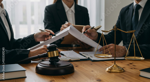 Lawyers reviewing documents with gavel and scales of justice on a wooden table in a bright office space
