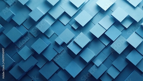 Layered geometric squares in varying blue tones create dynamic, three-dimensional abstract pattern. Clean, modern design offers subtle shadow, contrast, suitable for contemporary backgrounds, decor,