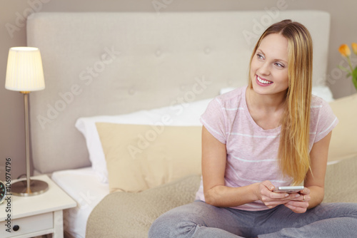 woman, mobile phone, camera phone, bed, bedchamber, hotel, vacation, hotel room, text message, message, tap, online, media, technology, morning, evening, house, order, wi-fi, networked, cyberspace, surf, sitting, home, beauty, interior, home, relaxation, laid back, serene, female, bright, blond, modern, attractive, self-assured, long hair, pajama, 20s, smile