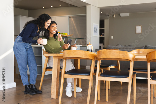 Leaning Diverse female friends chatting over coffee in modern kitchen, with smartphone, fruit bowl