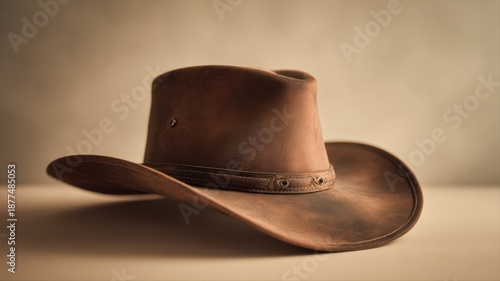 Leather Cowboy Hat with Wide Brim, Rustic Western Style, and Neutral Background