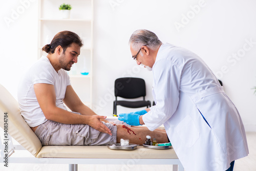 Leg injured man visiting old doctor in first aid concept