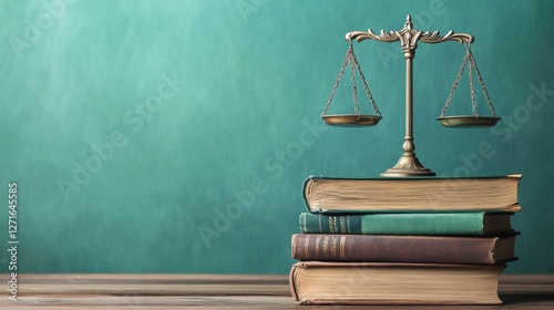 Legal Concept Representation with Justice Scales on a Stack of Books Against a Teal Background