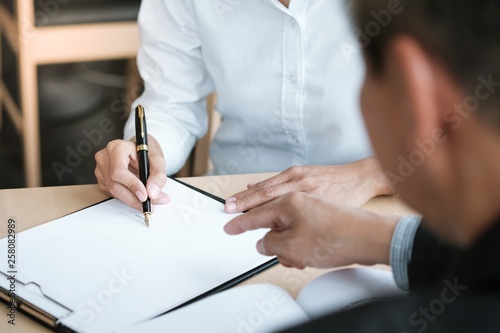Legal counsel presents to the client a signed contract with gavel and legal law. justice and lawyer concept.