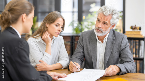 consultation, legal, financial, adviser, lawyer, client, couple, document, signing, paperwork, contract, meeting, office, pensive, discussion, talking, decision, agreements, advice, professional, business, corporate, man, woman, service, banking, insurance, investment, real estate, lawyer, teamwork, guidance, inheritance, mortgage, planning, communication, focused, problem solving, client, customer service, wealth, finance, broker, tax, retirement, reviewing, listening, explaining