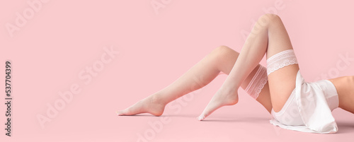 Legs of beautiful young woman in white stockings on pink background with space for text