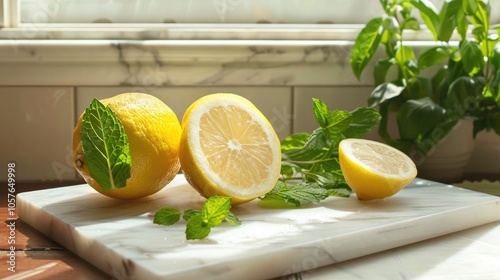 lemon, kitchen, background, counter, fruit, mint, white, marble, spring, organic, lemonade, board, yellow, summer, interior, pot, sink, display, leaf, half, favor, blur, design, cooking, product, citrous, window, food, table, light, template, green, cocktail, stone, natural, vitamin, beverage, ingredient, garnish, sour, utensil, composition, sill, closeup, copy space, cut, defocused, fresh, preparation, receipe