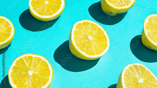 lemon, citrous, fruit, pattern, background, yellow, turquoise, fresh, slice, half, summer, bright, vibrant, minimal, minimalism, design, wallpaper, food, healthy, vitamin, organic, natural, vegan, vegetarian, juicy, tropical, sunshine, shadow, sunlight, aesthetic, colourful, decorative, arrangement, macro, topview, creative, composition, freshness, refreshing, diet, wellness