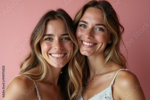 Lesbian happy couple smiles and hugs on a studio background. The concept of same-sex love and tolerance. Lgbtq community, freedom and lgbt people with pride. Generative AI