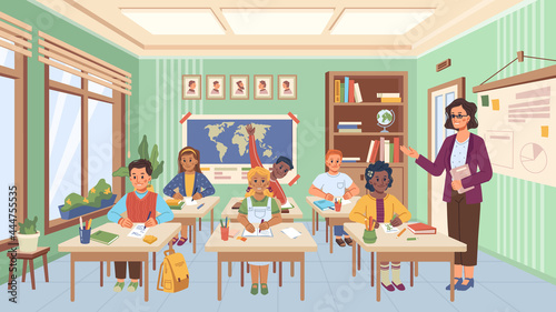 Lesson in school, kids listening and answering teachers questions on classes. Education and studies for children, classroom with desks and world map. Geography professor. Flat style cartoon character