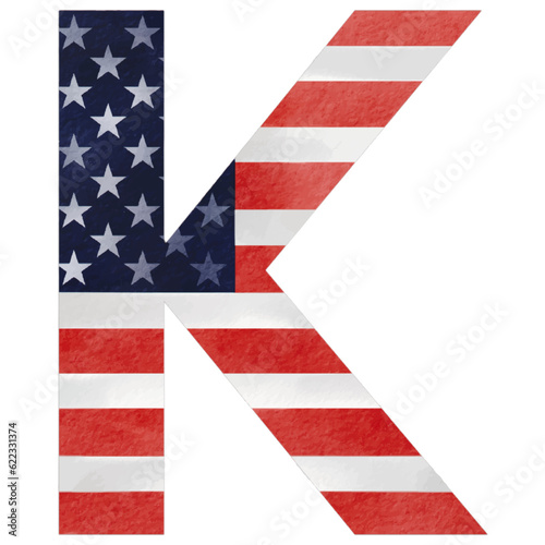 Letter K hand painted USA alphabet text with United state of America flag inside watercolor brush paint isolate on white background. Vector illustration