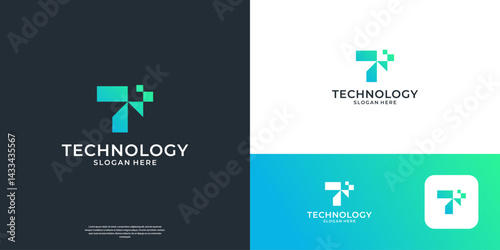 Letter T tech logo design vector. Abstract future icon with digital pixel symbol logo.