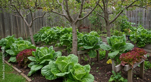 Lettuce and Cabbage Growing Under Apple Trees in an Urban Garden