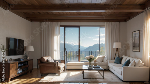 decoration, living room, forest, lounge, architecture, lamp, three-dimensional, luxury, comfortable, apartment, armchair, television, coffee table, interior, home interior, decoration, facility, curtain, balcony, white, bright