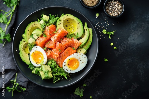 lifestyle concept, photo of an healthy meal with avocados and eggs on plate, salmon fish salad in bowl