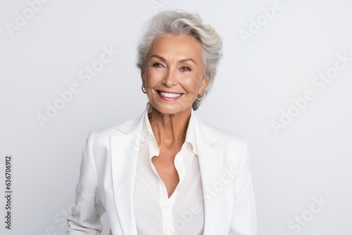 latin america, argentine, colombian, mexican, chilean, peruvian, elderly, fashion, business, professional, tailored, jacket, blazer, formal, sophisticated, attire, classic, minimal, empty, isolated, clear, neutral, white background, clean, plain, blank, simple, head shot, portrait, assured, smug, happy, relieved, comfortable, pleased, contented, wisdom, grandmother, retirement, 70s, female, ageing, senior, golden years