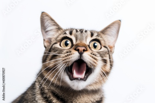 Lifestyle portrait photography of a curious tabby cat meowing against a white background. With generative AI technology