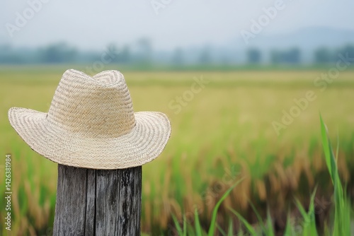 Light beige straw hat rests on rustic wooden post in a golden rice paddy field.