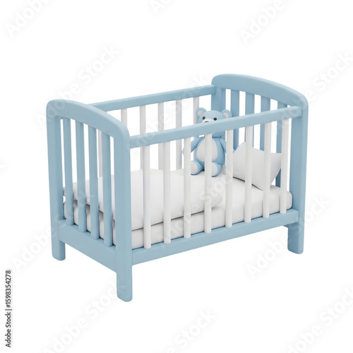 Light Blue Baby Crib with Plush Bear and White Bedding in Nursery