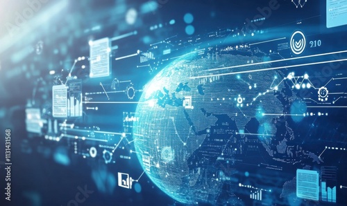 Light blue background with a digital globe, world map, and global network connections on the right side of the screen The design is simple yet sophisticated, featuring light blue tones Generative AI