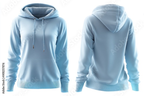 hoodie, apparel, clothing, garment, sweatshirt, front, back, view, long sleeve, casual attire, hood, pocket, drawstring, ribbed, fabric, cotton, textile, design, style, fashion, blank, template, presentation, merchandise, wear, outfit, activewear, comfortable, indoor, studio, isolated, white background, light blue, nobody, soft, simple, modern, trendy, promoting