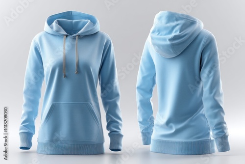 hoodie, sweatshirt, apparel, clothing, garment, template, design, fashion, casual attire, wear, textile, fabric, front, back, view, presentation, style, hood, sleeve, pocket, cord, drawstring, light, blue, plain, blank, retail, shop, product, display, studio, isolated, standing, studio shot, promotion, advertising, marketing, merchandise, comfortable