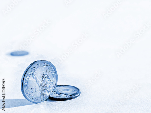 Light blue tinted background on the theme of USA economy, finance or banks with space for text. An American 1 one dollar coin stands on its edge. US coins backdrop with copy-space. Macro