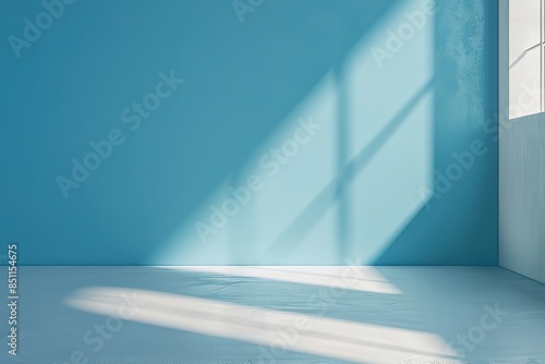 Light blue wall with light and shadow, white floor background, clean, simple, minimalist style, blank space, large area of