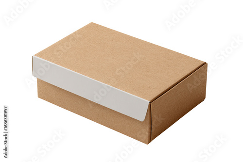 Light brown cardboard box with white top flap