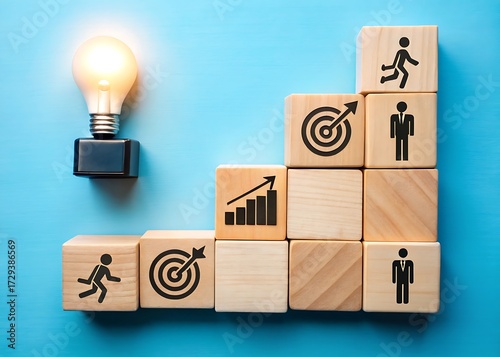 block, wooden, light, bulb, idea, innovation, business, strategy, symbol, growth, success, goal, target, achievement, leadership, management, planning, solution, development, progress, risk, opportunity, challenge, vision, mission, value, teamwork, collaboration, communication, finance, investment, marketing, sale, analysis, datum, information, technology, concept, abstract, blue, step, ladder, climb, career, job, work, toy, game