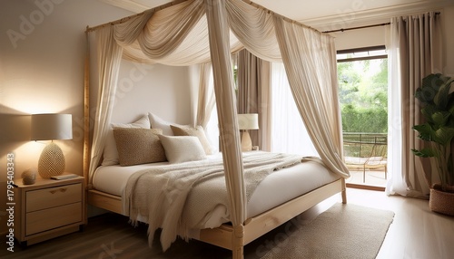 light, filled, bedchamber, draped, canopy, bed, interior, design, home, luxury, cosy, clean