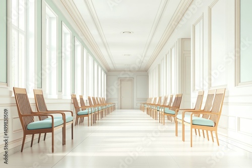 hallway, interior, light, chair, waiting, empty, modern, classic, elegant, pale, pastel, waiting room, wooden, furniture, calm, peaceful, sunlight, corridor, long, perspective, symmetry, white, beige, window, detail, design, architecture, room, sophisticated, minimalist, modern style, luxury, clean, bright, calmness, serene, formal