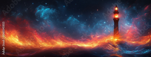 banner, lighthouse, beacon, light, bright, hope, hopefully, believe, salvation, sun, sunset, sunlight, ocean, sea, wave, sky, cloud, water, storm, evening, dark, seascape, landscape, cloudscape, nature, navigation, building, tower, safety, beautiful, travel, artwork, loneliness, majestic, dusk, generative, al, orange, red, blue, black
