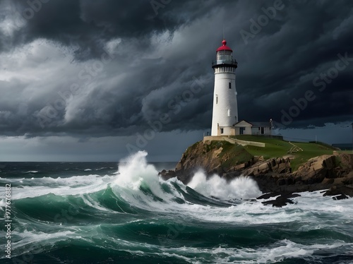 Lighthouse on Rocky Coast with Stormy Sea and Dramatic Clouds