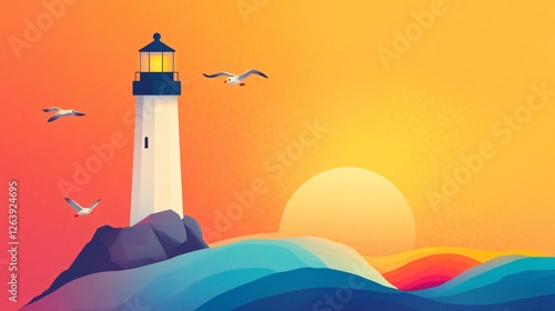 lighthouse, sunset, ocean, sea, wave, seagull, sky, vibrant, landscape, scenic, beautiful, nature, nautical, coastal, seascape, beach, horizon, solitude, calmness, peaceful, calming, travel, adventure, inspiration, hope, guidance, freedom, wanderlust, dreamscape, digital artwork, illustration, abstract, colourful, gradient