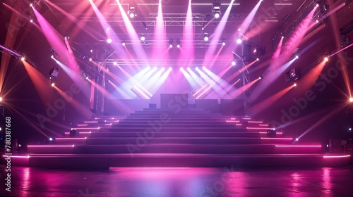 anime, stage, empty, stair, dais, pink, purple, vibrant, colourful, atmospheric, performance, entertainment, theatrical, venue, spotlight, artistic, visual, dynamic, illumination, dramatic, composition, high-coloured, contrast, captivating, fantasy, surreal, dreamlike, music, concert, light, night, disco, show, star, background, club, theatre, bright, shine, laser