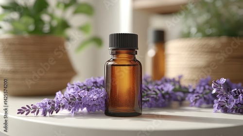 Lilac essential oil bottle in a clean, minimalistic setting, evoking natural simplicity and purity.