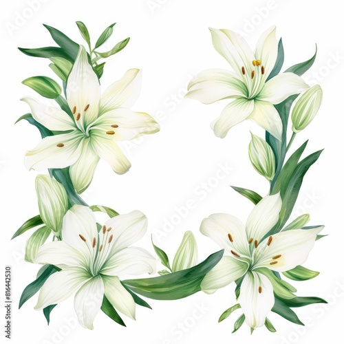 lily themed frame or border for photos and text.elegant white petals and green stems. watercolor illustration, wreath of Lily flowers and green leaves.