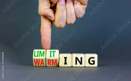 Limiting global warming symbol. Concept words Limiting and Warming on wooden cubes. Businessman hand. Beautiful grey table grey background. Business limiting global warming concept. Copy space.