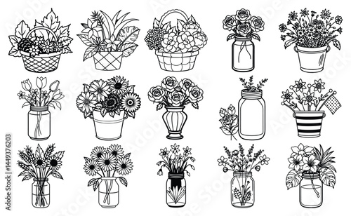 Line art illustrations of various floral arrangements in baskets, jars and pots, featuring sunflowers, daisies and mixed flowers.