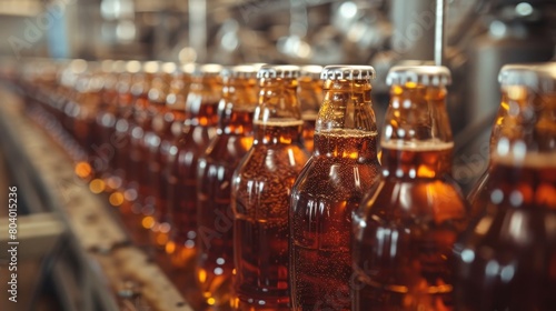 Line of bottling of cola soda bottles on clean light factory