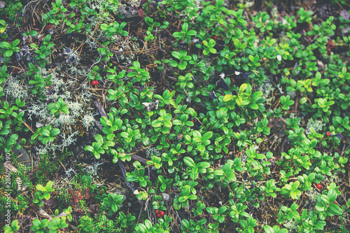 Lingonberry (Vaccinium vitis-idaea) growing in a swamp. Nature background