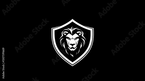 Lion head shield emblem, black background, protection concept, logo design