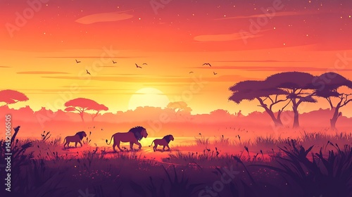 lion, lion, pride, sunset, savanna, africa, african, wildlife, animal, animal, landscape, nature, scene, background, illustration, digital artwork, vector, graphic, design, artwork, majestic, wild, plain, horizon, orange, red, sky, evening, dusk, calmness, peaceful, serenity, family, mammal, big cat, felino, safari, travel, adventure, photograph, photo, art