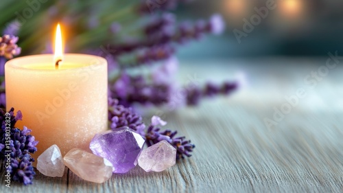 Lit candle with crystals and lavender on wooden surface, evoking calmness relaxation