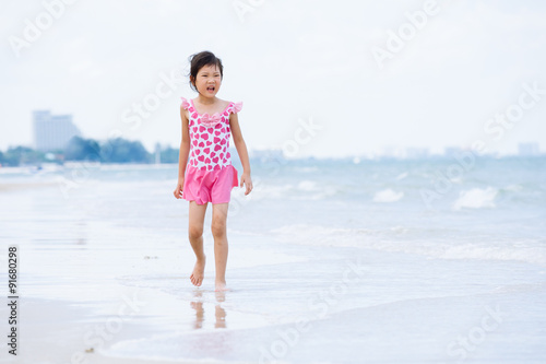 Little asian girl walk on the beach