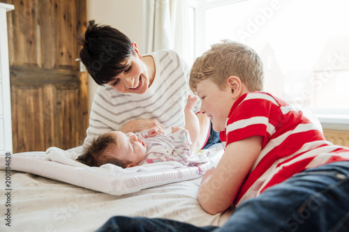 Little boy and his mother are being playful with the baby after changing her nappy on the bed.